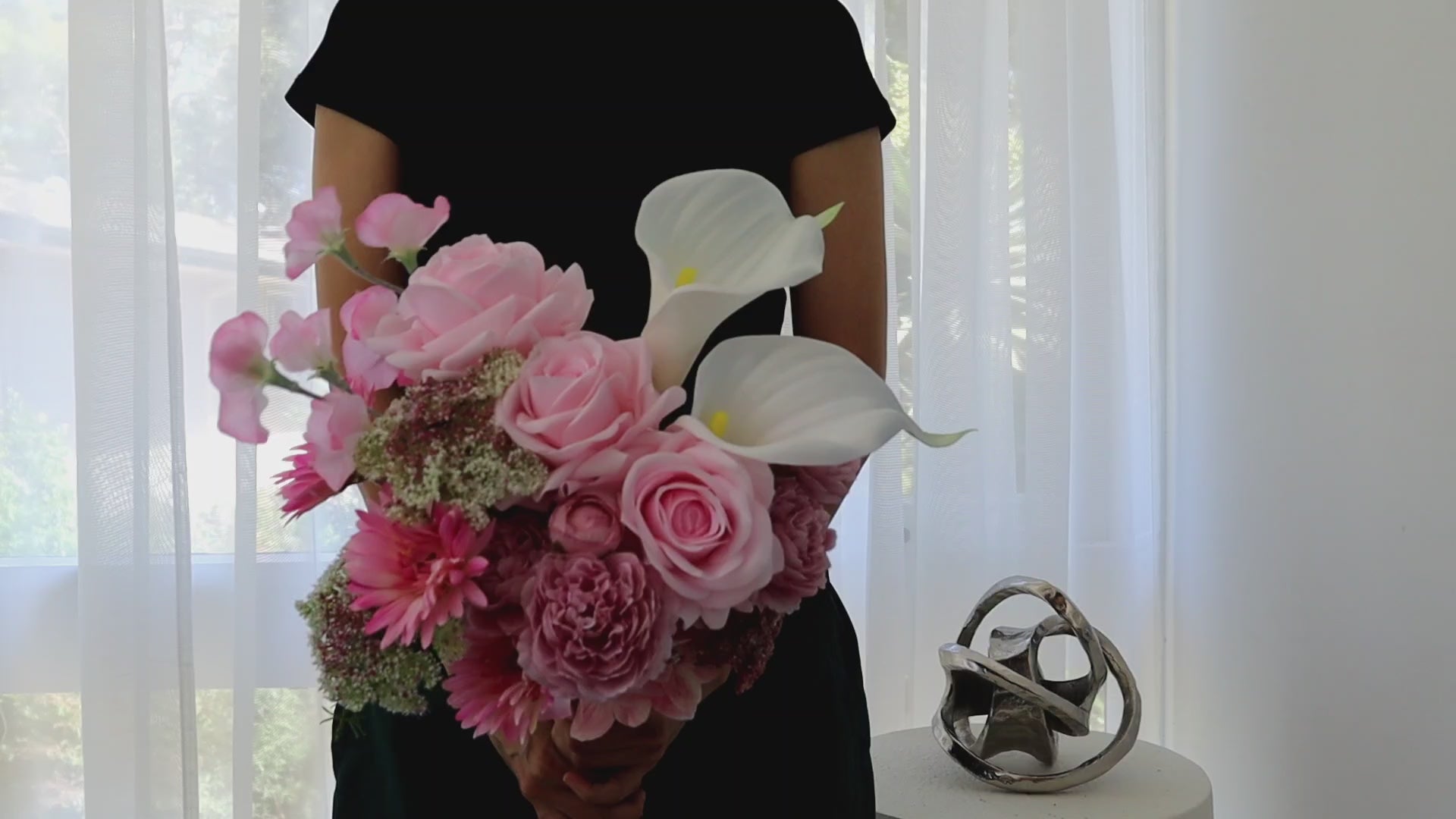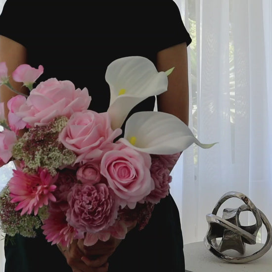 A soft blush romantic bridal bouquet featuring real touch silk roses, delicate carnations, gerbera, hydrangeas, Queen Anne’s lace, and an elegant white calla lily for a graceful finishing touch.