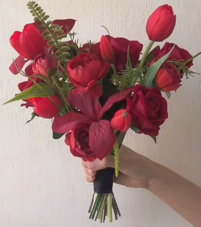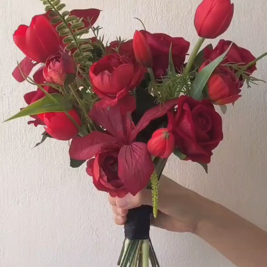 This luxurious bouquet combines red roses, tulips, and ranunculus with lush foliage to evoke passion and elegance.