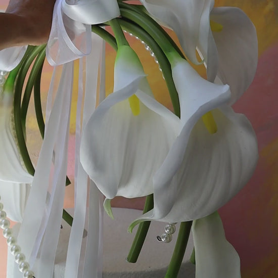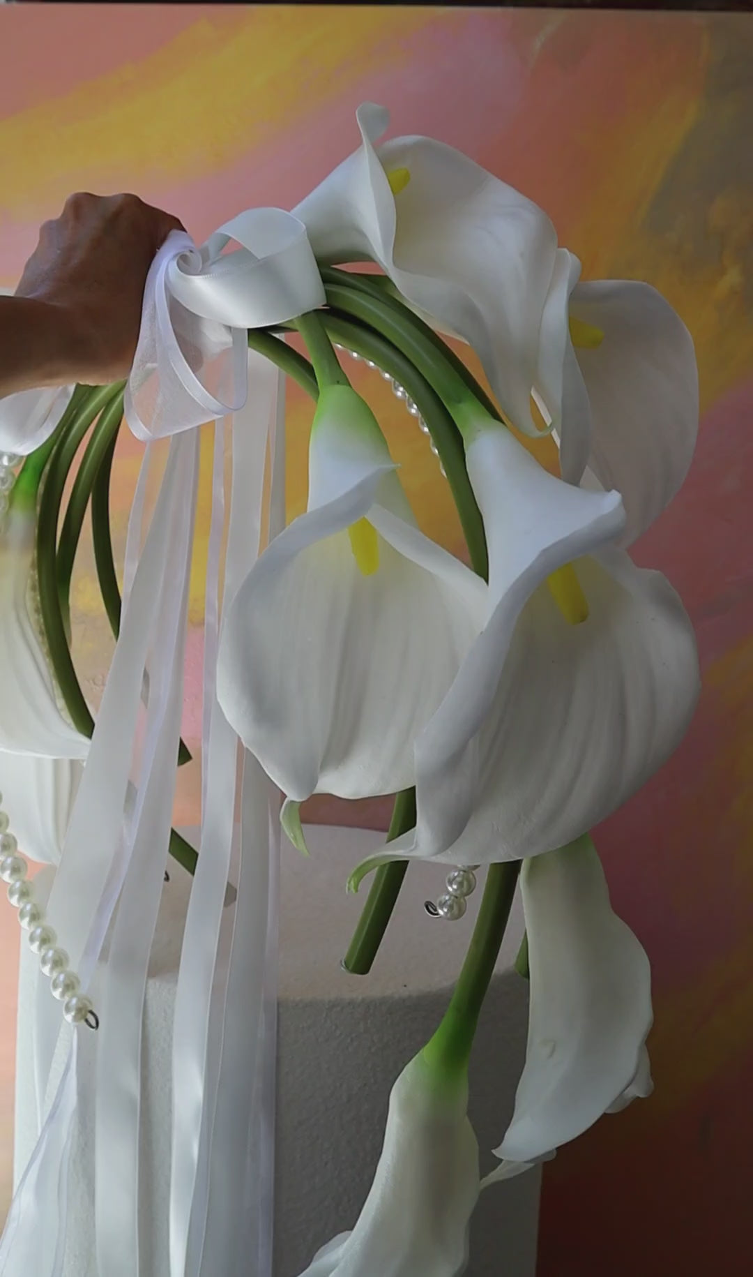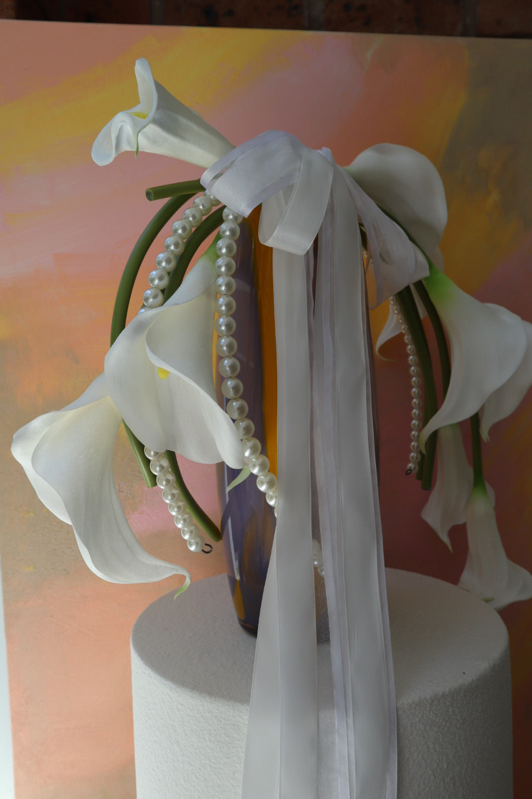 The Draped Calla Lily Halo is a sculptural floral art piece created with premium real-touch silk calla lilies, soft flowing ribbons and refined pearl detailing.