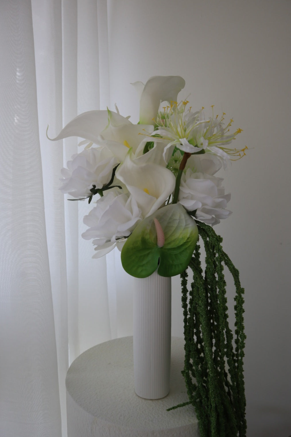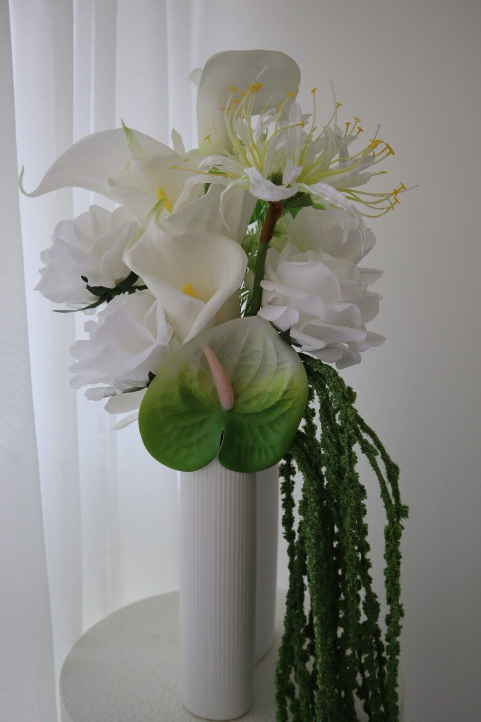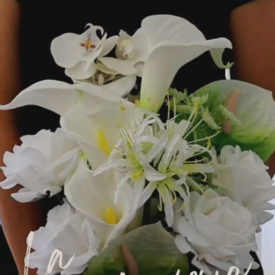 This bouquet features luxurious white calla lilies, paired with soft white blooms and fresh green anthurium, finished with cascading amaranthus for a natural draping silhouette.