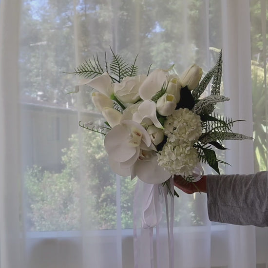 Designed with sculptural white calla lilies, delicate phalaenopsis orchids, soft tulips and full hydrangea blooms, this bouquet is layered with natural greenery and soft trailing details to create a modern yet classic silhouette.
