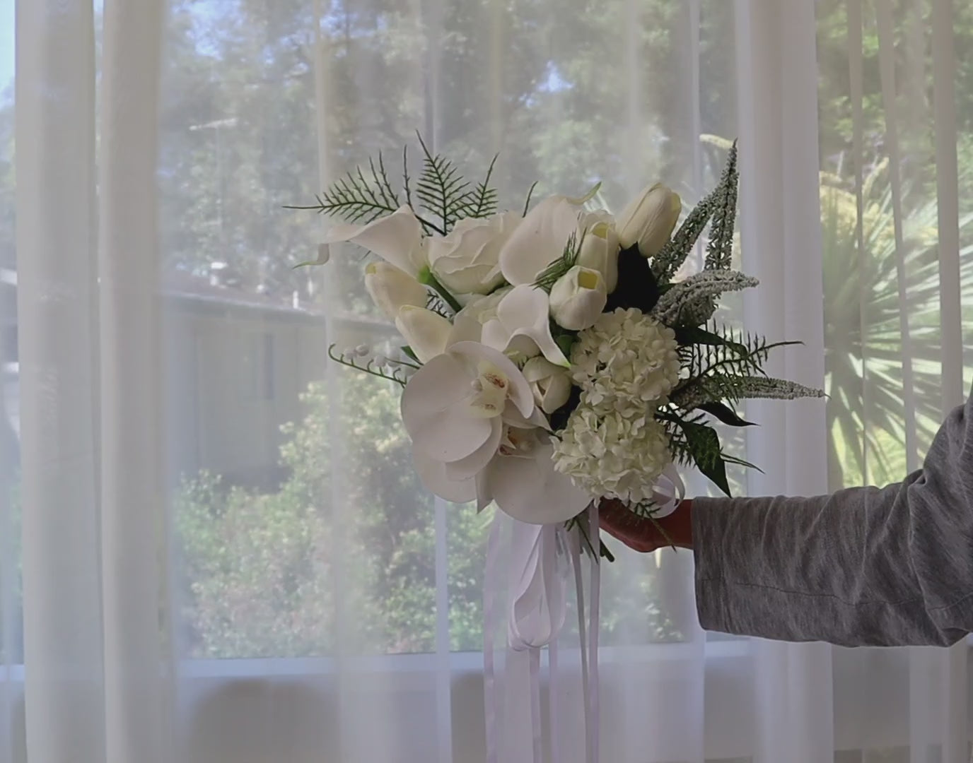 • Flowers include: White Calla Lily, Phalaenopsis Orchid, Tulips, Hydrangea & seasonal white fillers