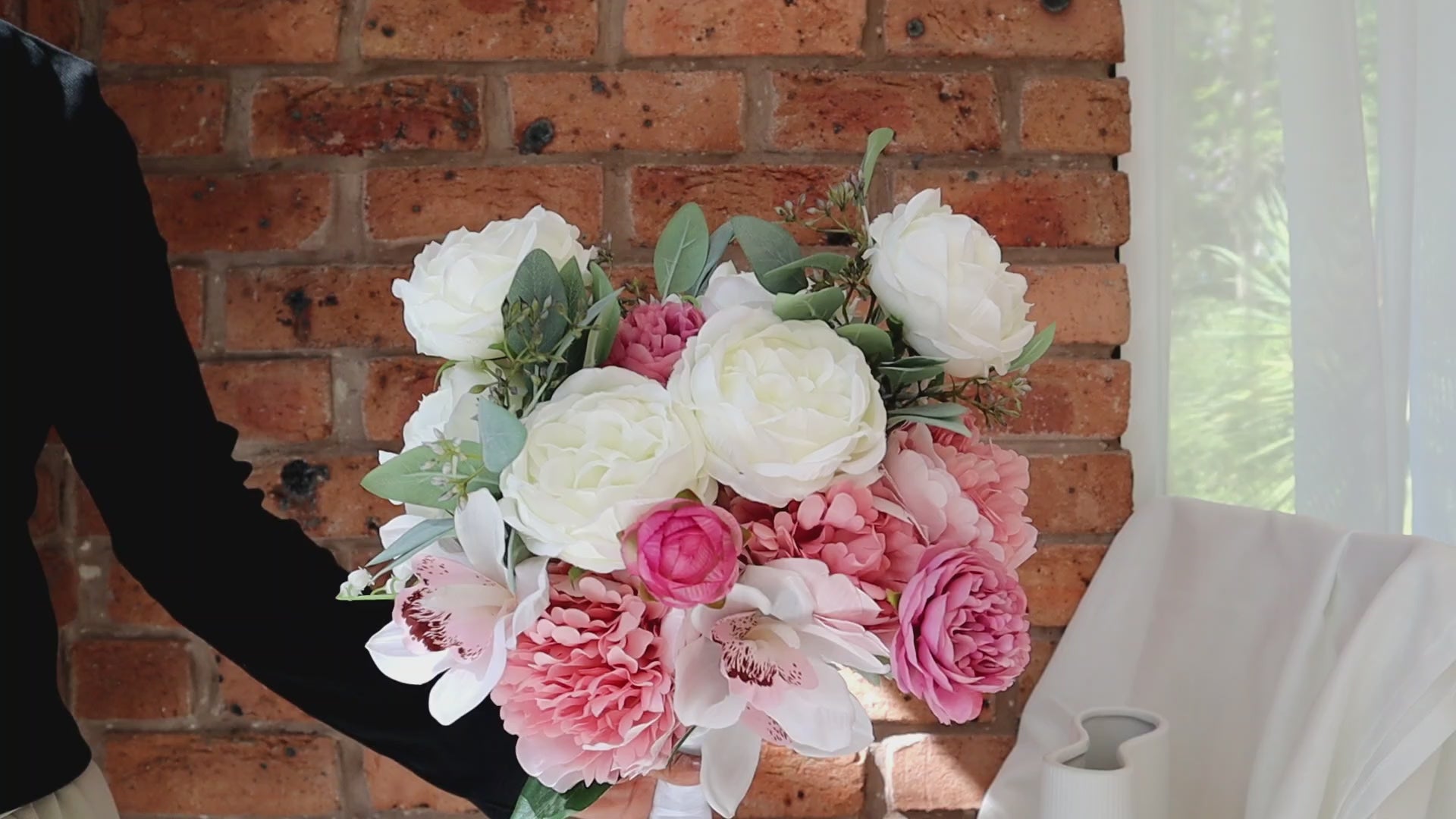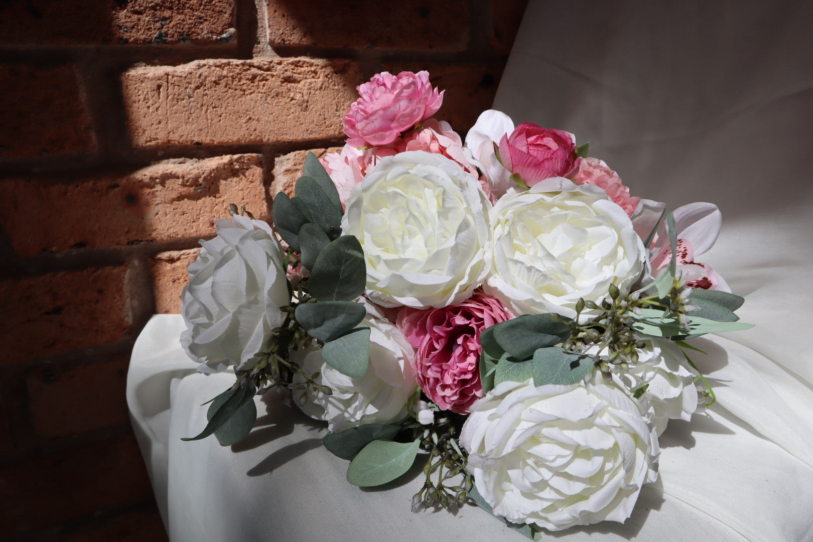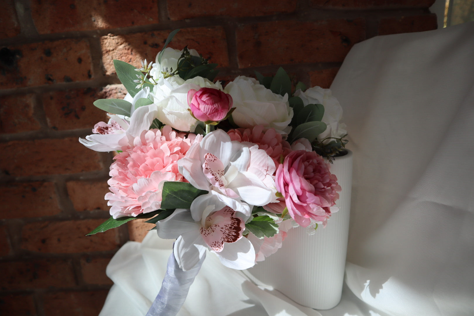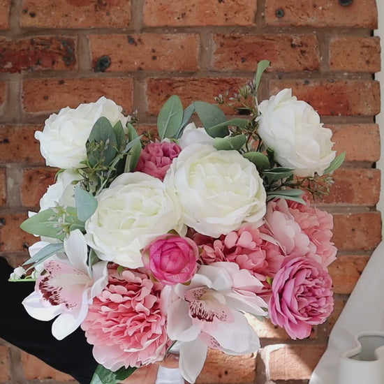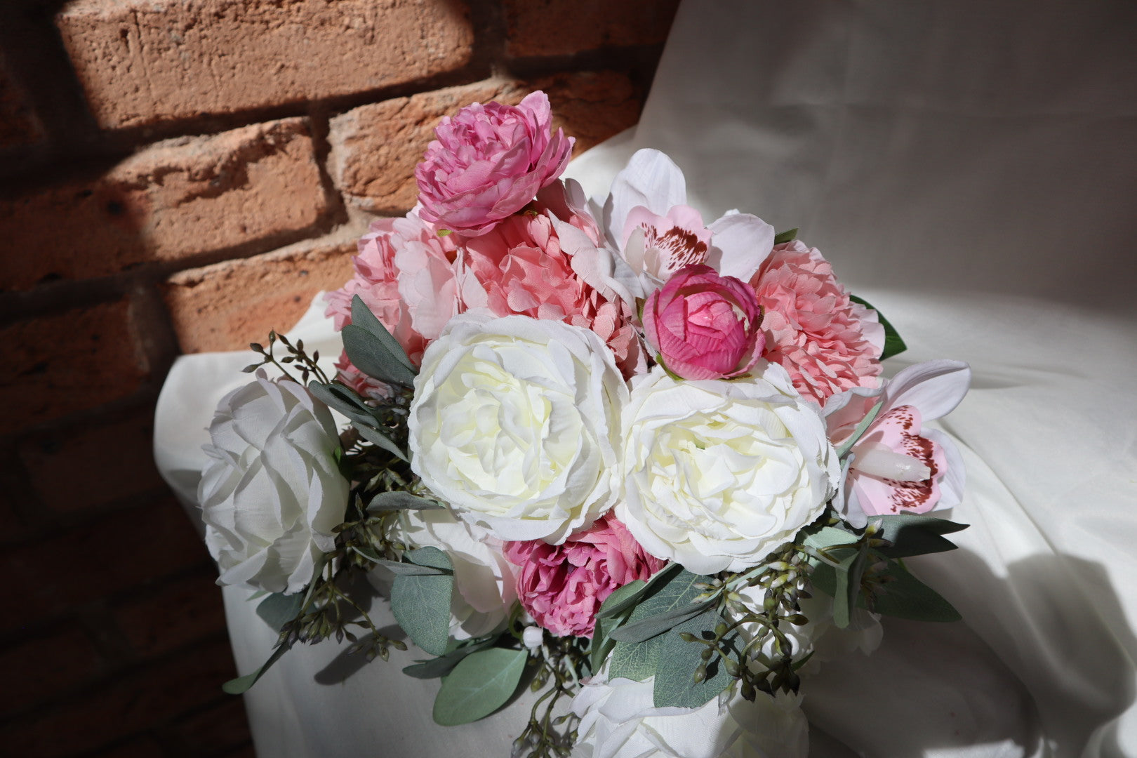 A timeless silk wedding bouquet featuring soft blush peonies, delicate ranunculus, and creamy white orchids.