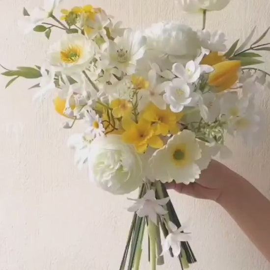 This wildflower-inspired silk wedding bouquet blends fresh white blooms with soft yellow and buttery cream tones, creating a naturally effortless and romantic look.